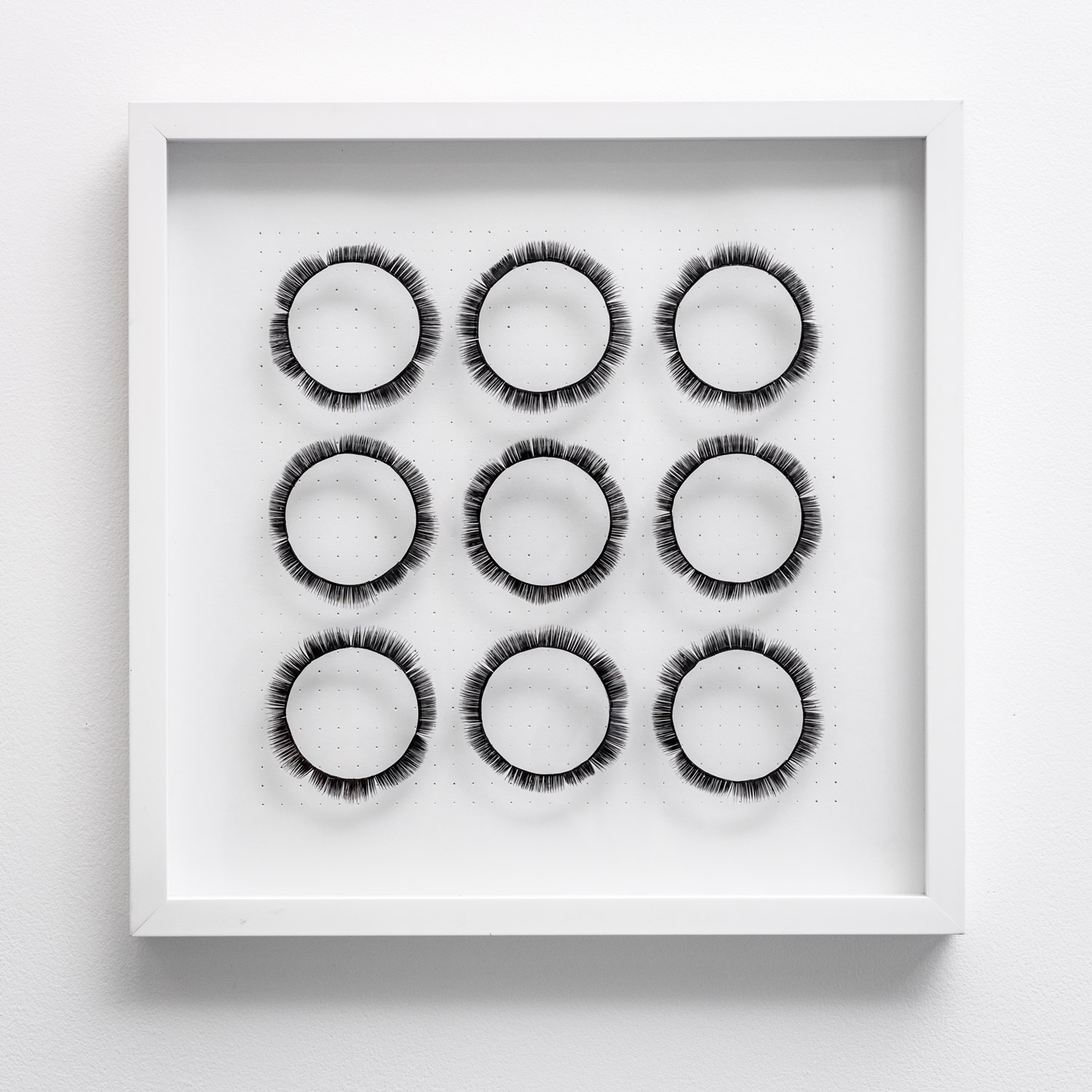 This series of drawings references 70s Minimalist ideals creating echo chambers that reverberate with notions of perfection and attraction. They mystify their familiarity through substituting the finely calibrated application of graphite with that of artificial lashes.