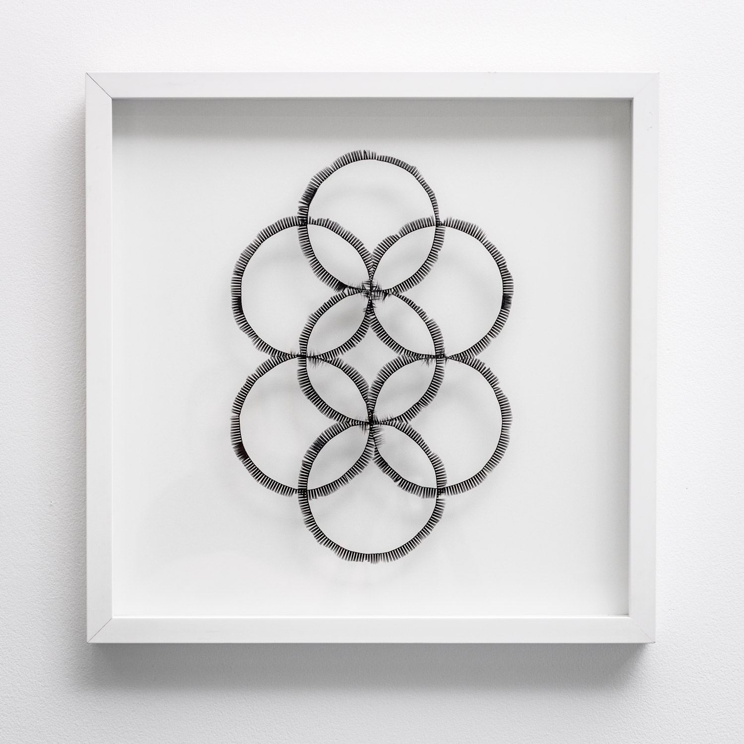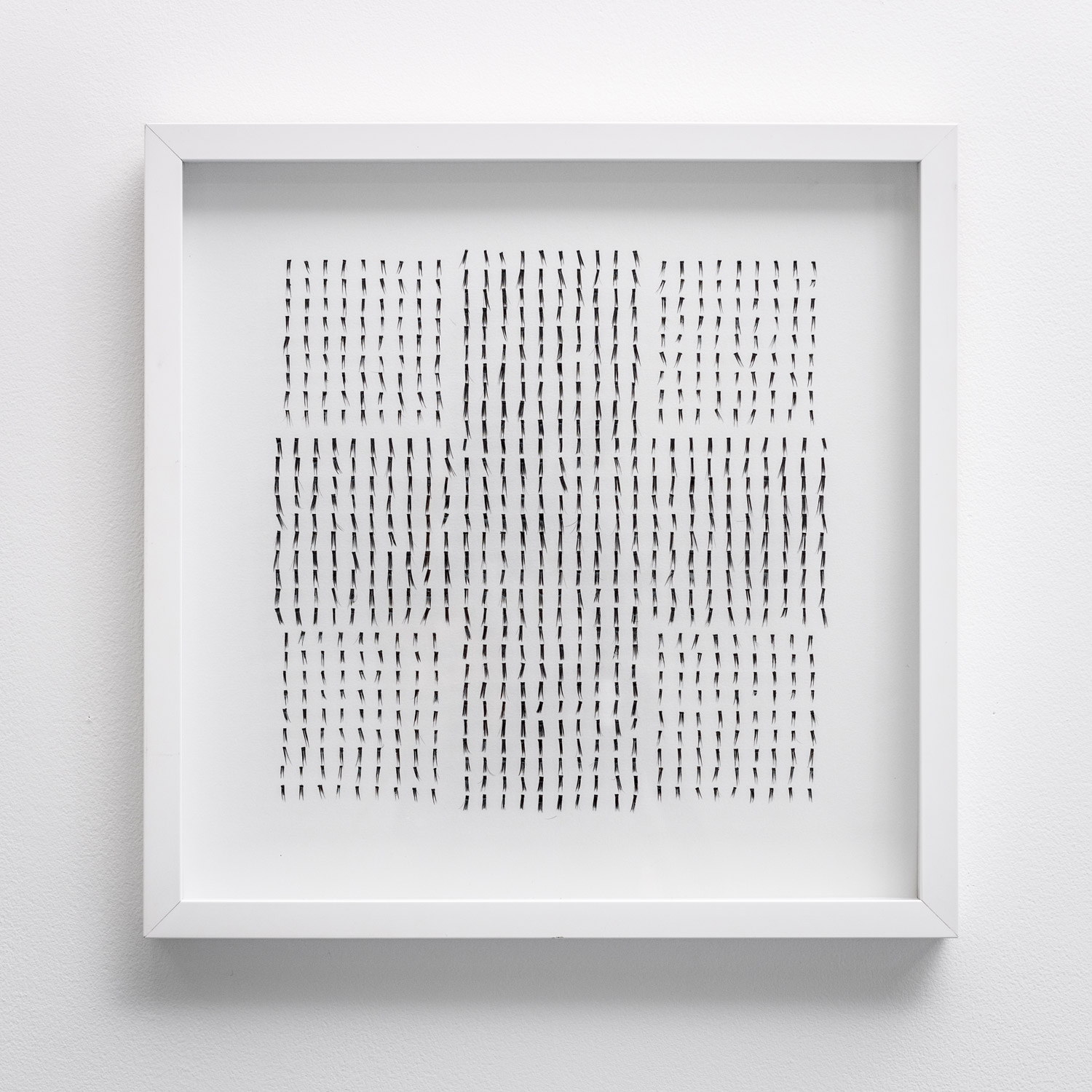 The same quiet intensity of mark making is evident in the works of artist Eva Hesse. While I was watching my mother, Hesse (along with other Minimalist Artists) was playing with notions of repetition and symmetry - creating drawings by systematically and methodically filling in the squares of graph paper with tiny marks. At first sight my drawings seem to offer a similar intimacy through gesture but closer inspected reveals instead a proxy, for what appears to be drawn lines are in fact false eyelashes meticulously applied to the glass surface of shadow box frames. Laid on the underside of the glass the lashes cast shadows onto the paper below making it hard to determine what is real and what is merely projected.