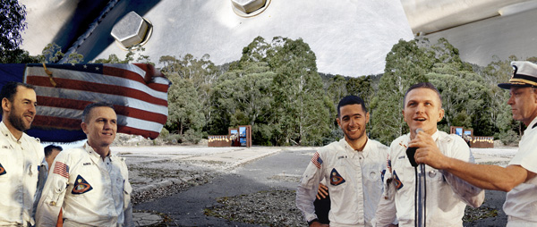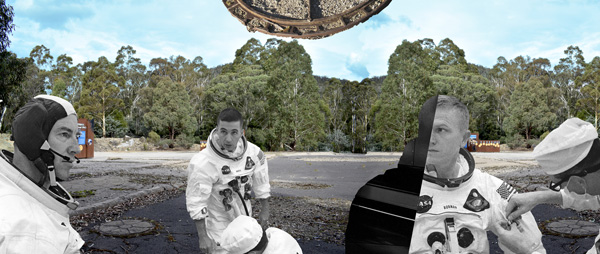 The works are photocollages made from historical NASA images and the artist’s own photographs of the site of the former Honeysuckle Creek Tracking Station near Canberra, which helped track the Apollo missions. They were created for the artist’s current PhD research at ANU School of Art and Design on national memory and the fiftieth anniversary of the first moon landing.