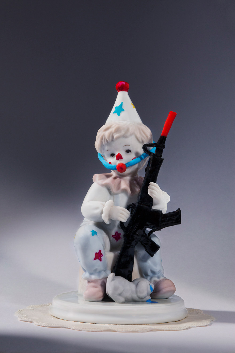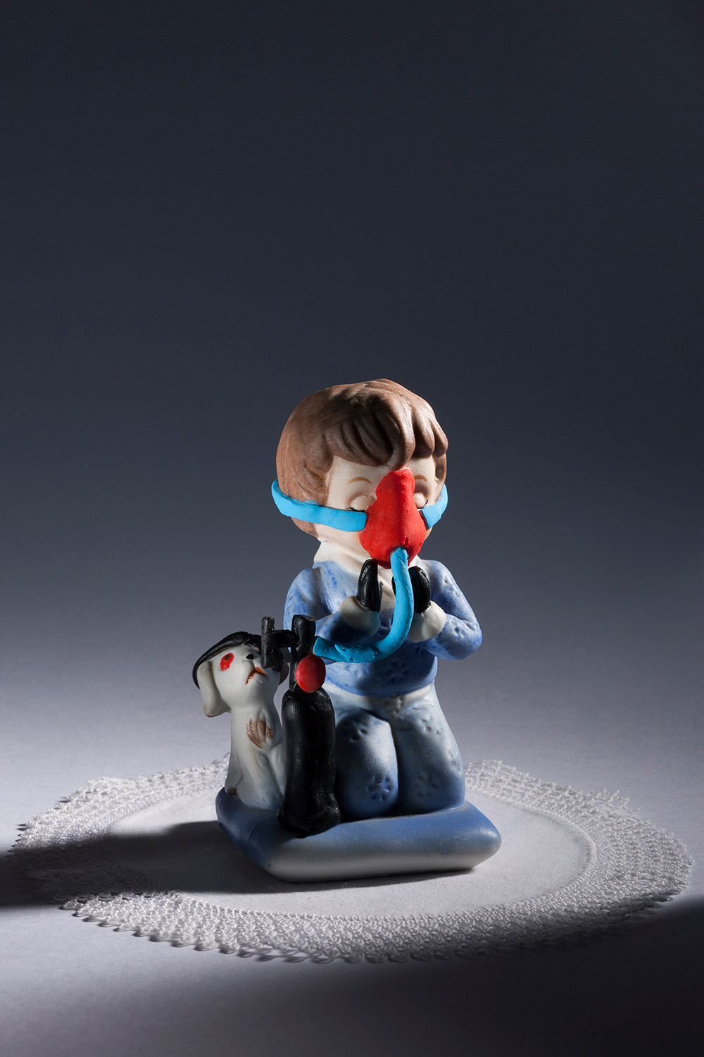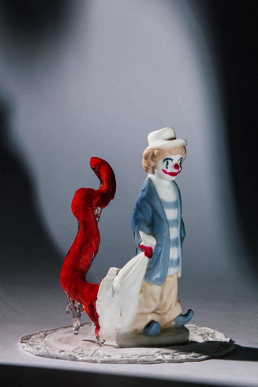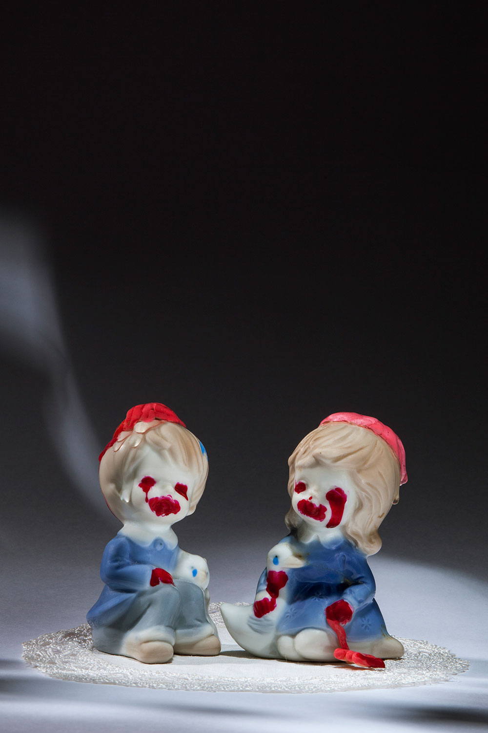 God Told Me So, To My Face examines the consequences of aspiring to the manufactured ideologies produced through consumer imagery and objects. These representations have been constructed through popular culture, and are embedded in our consciousness and beliefs from early childhood. At the heart of these consumer desires, lies the photograph and its powerful ability to influence, persuade and commodify. The domestic decorative ornament —unassuming and unresponsive —seemingly has no function or purpose other than for aesthetic pleasure. Through the modification of the once loved and mass produced ceramic figurines, the works seek to disrupt the intended innocent, unthinking, and obedient characters to produce a dark and disturbing alternative. In stylistically photographing them, both a cognitive dissonance and a new veneer are produced, revealing the deception while also re-commodifying it.